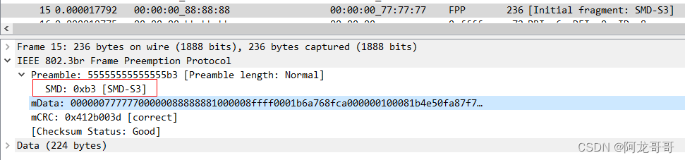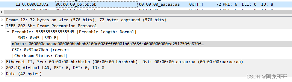 Preemptable帧与普通的以太网帧会有所区别,在Preamble后面,带的是SMD-Sx, SMD-Cx这些