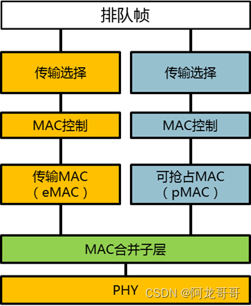TSN的802.1Qbu和IEEE 802.3工作组共同开发了IEEE 802.3br,即可抢占式MAC机制。基于抢占式MAC的传输机制如下图所示。其采用了802.3TG中的帧抢占机制,将给定的出口分为2个MAC服务接口,分别称为可被抢占MAC(pAMC-Preemptable MAC)和快速MAC(eMAC-express MAC)。pMAC可以被eMAC抢占,进入数据堆栈后等待eMAC数据传输完成,再传输。
