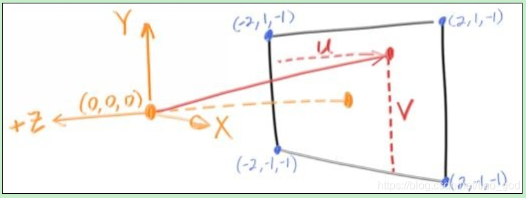 我经常在使用正方形图像进行调试时遇到麻烦,因为我经常转换x和y,所以我将坚持使用200x100图像(这里我还是用的512*512的图像)。我将把“眼睛”(或者相机中心,如果你想到相机的话)设为(0,0,0)。我让y轴向上,x轴向右。为了尊重右手坐标系的对流,进入屏幕的是负z轴。我将从左下角遍历屏幕,并使用沿屏幕边的两个偏移向量来移动屏幕上的光线端点。请注意,我没有将光线方向设置为单位长度向量,因为我认为不这样做会使代码更简单、速度略快。