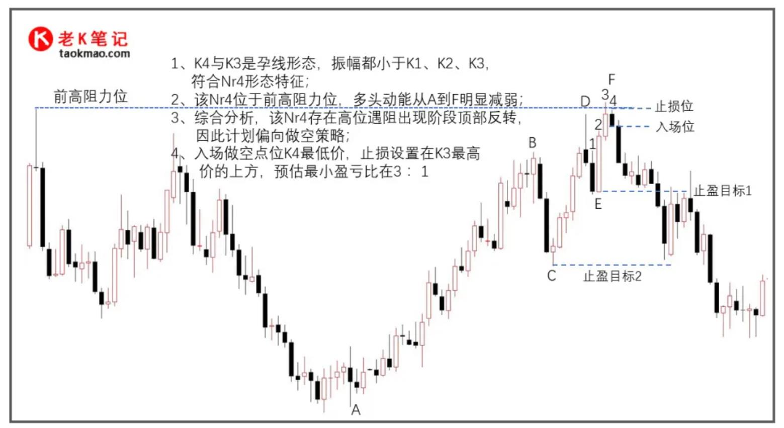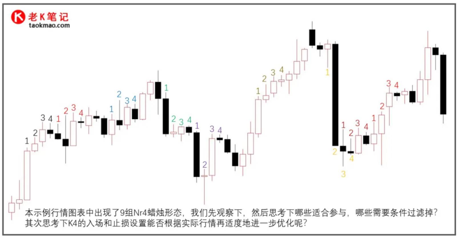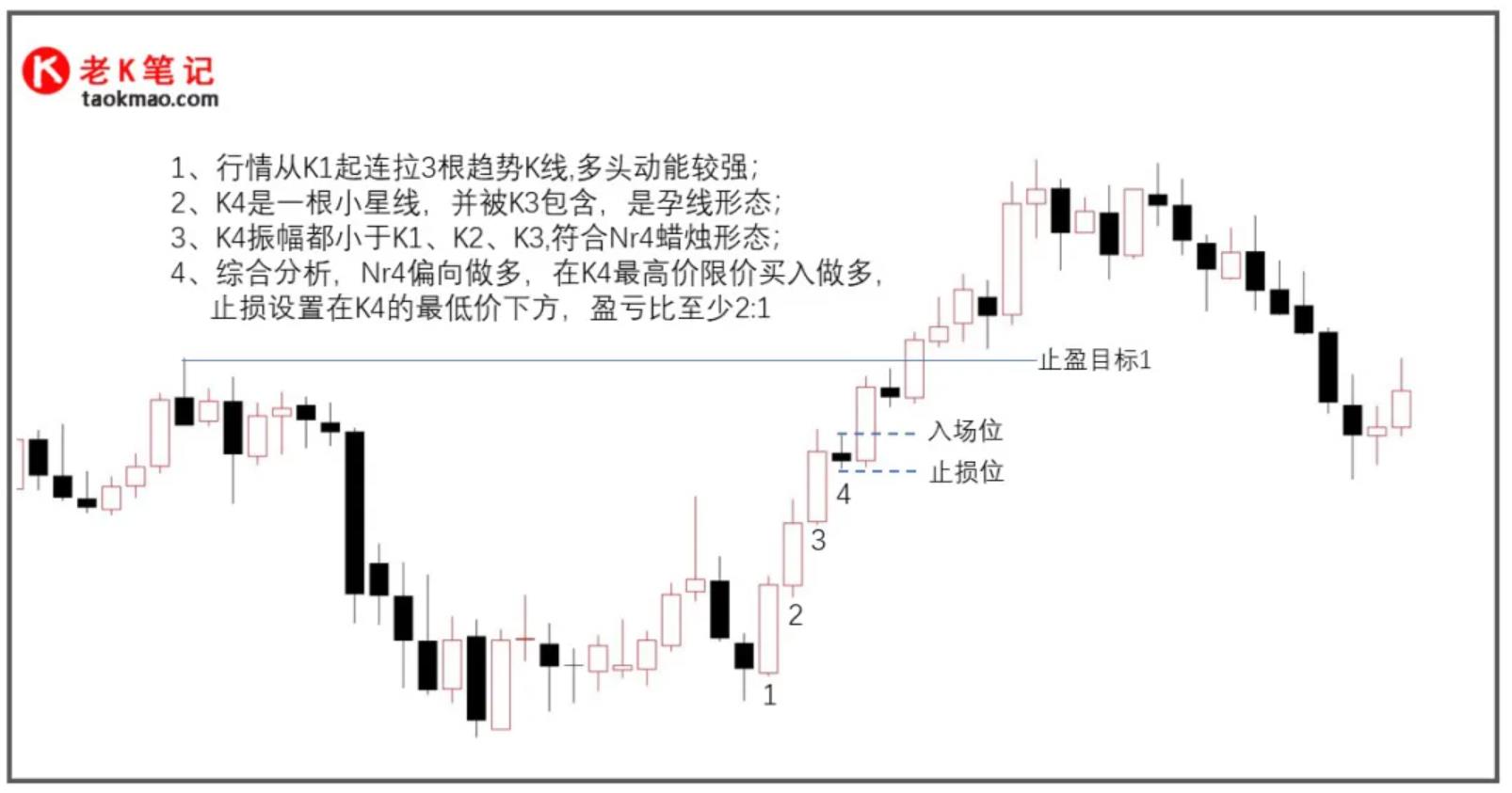 2、 分析Nr4蜡烛形态所处的交易背景,选择位于关键支撑阻力位和顺结构趋势顺动能方向、盈亏比合理的Nr4形态;