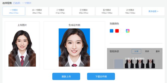 上传图片,选择需要的证件照尺寸、背景颜色,完成后保存即可。