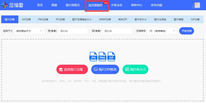 在浏览器中搜索压缩图网站,打开后从导航栏中选择【证件照制作】。