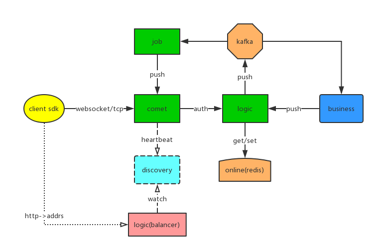 同时 Job 中也充分利用 goroutine 和 channel,在 Job 中 每个 comet 区分不同的消息推送通道。