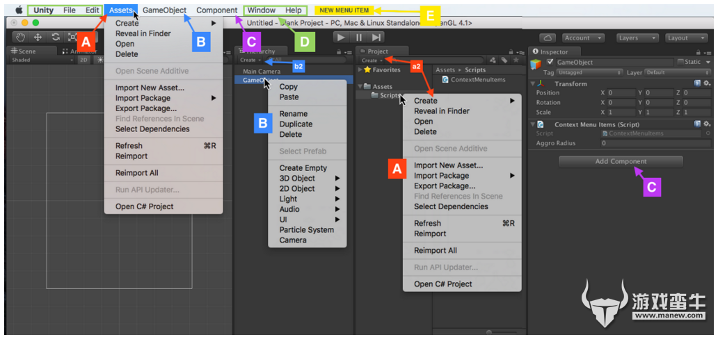 component菜单下的内容必须继承monobehaviour,因此需要使用AddComponentMenu添加,其他使用方法相似