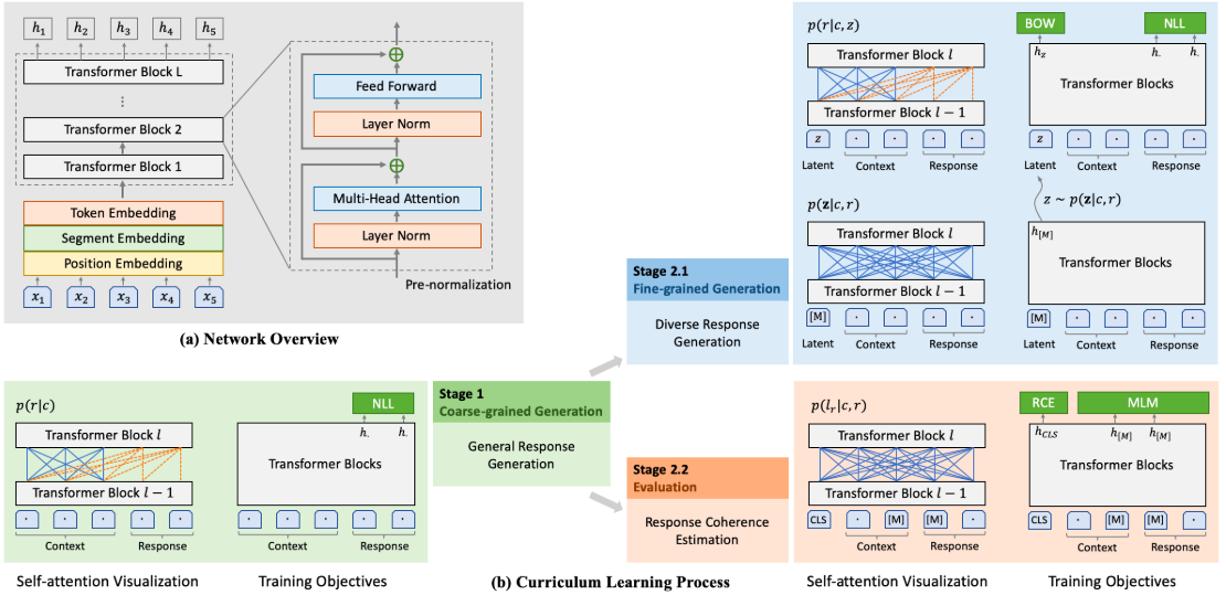 相较于其他开放域对话系统,Plato的优势在于一问多答情景下的处理,即一个问题对应多个不同的答复,找出合理的答复进行对话。这个模型包括两个学习过程(如上图),第一阶段用当前表现很好的一对一对话的模型进行初步训练;第二步进行微调,学习不同情景的对话生成并进行评估。由于Plato采用了更好的策略应付更加现实的场景,其在对话评估取得了目前最好的结果。