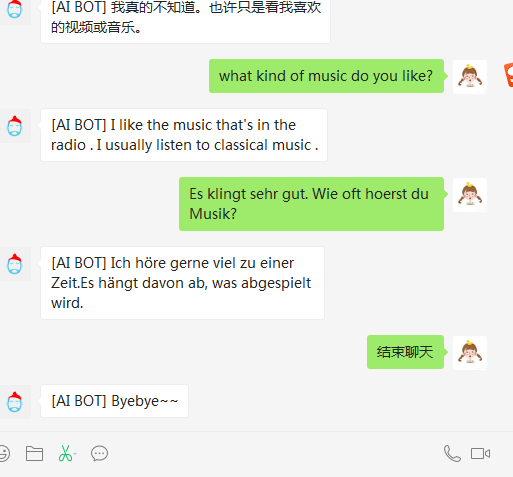 本项目主要难点是协调不同语言内容在多轮对话中进行交互,展现plato2模型强大的能力。另一方面亮点,结合了百度翻译开放API,无缝对接,最终通过Wechaty保证了用户在终端丝滑般的切换语言聊天。用户可以很方便的体验聊天的乐趣,寻找聊天话题不冷场,还能将本应用当成外语学习的好工具。