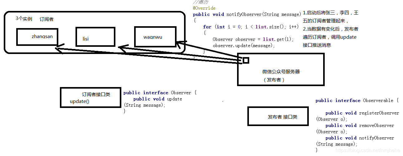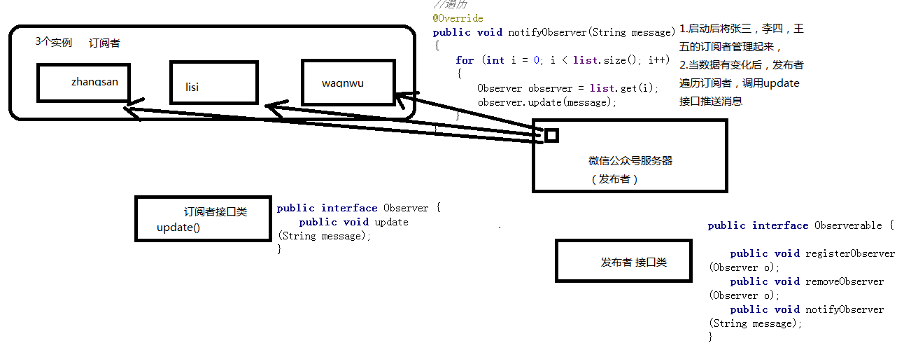 {//注意到这个List集合的泛型参数为Observer接口,设计原则:面向接口编程而不是面向实现编程private List list;private String message;public WechatServer(){list = new ArrayList();}@Overridepublic void registerObserver(Observer o){list.add(o);}@Overridepublic void removeObserver(Observer o){if (o!=null){list.remove(o);}}//遍历@Overridepublic void notifyObserver(String message){for (int i = 0; i < list.size(); i++){Observer observer = list.get(i);observer.update(message);}}public void setInfomation(String s){this.message = s;System.out.println("微信服务更新消息: " + s);//消息更新,通知所有观察者notifyObserver(message);}}