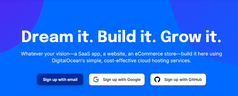 点击此处进入DigitalOcean的官方网站,进入之后,点击页面右上方蓝色的Sign Up按钮,然后会让选择注册方式,可以通过邮箱、谷歌账户、Github账户注册,根据自己偏好选择一种注册。