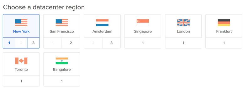DigitalOcean在7个国家建有数据中心,分布在8个不同城市(美国有两个,其他每个国家各一个),服务器地理位置的分布范围不如其他VPS提供商的那样广泛。如果你是大陆用户,这是一个需要考虑的方面,因为服务器地理位置与客户端之间的距离长短对数据传输速度有影响,在大陆使用最好选用位于亚洲的服务器,DigitalOcean在亚洲东部地区只有新加坡有1个服务器数据中心,当大量用户同时连接这个位置时会降低速度。海外用户如果是在美国、加拿大和欧洲可以不必考虑服务器位置问题,DigitalOcean在这些地区都有多个数据中心。