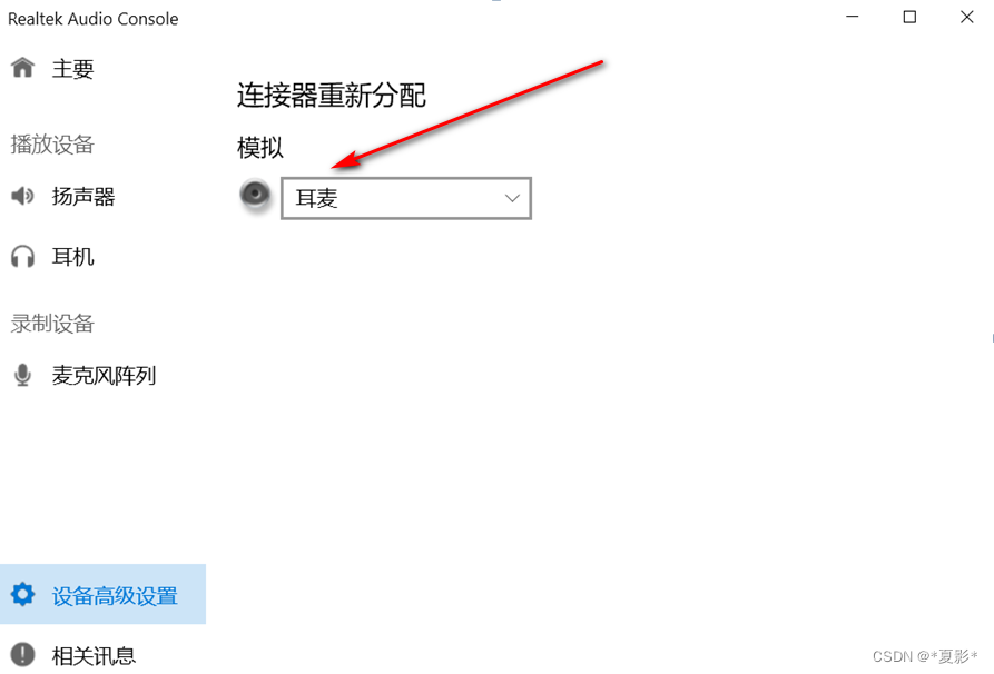 然后里面连接器重新分配这里,改为“耳麦”,即可用耳机的麦克风录制。