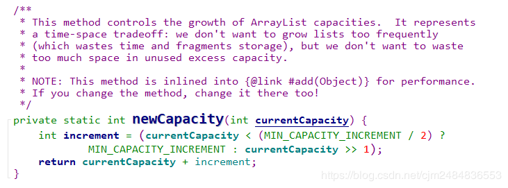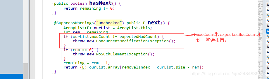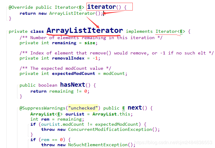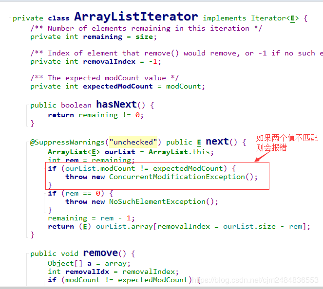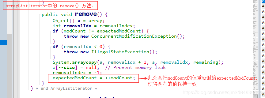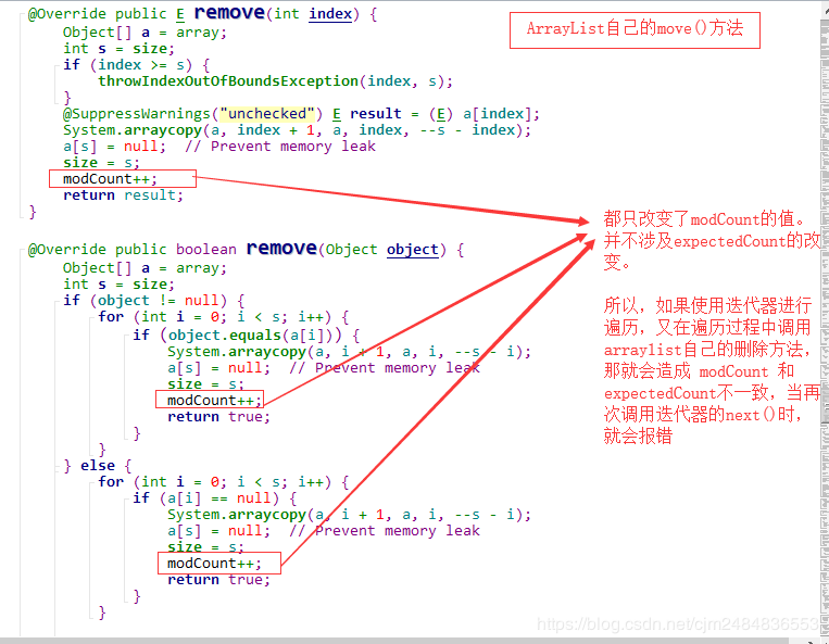 如果数组够用,即 s 如果数组满了,即s>=a.length时,这里就要: 先将原数组进行扩容,生成新的数组; 将原数组中index之前的数据复制到新数组对应的位置中去。 将原数组中index之后的数据往后挪一位的移动到新的数组中去。 将新数组赋给array。 三、将要添加的元素放在index的位置,同时有效数据个数size+1。 源代码见下图: 我们都知道,数组的大小是不可变的,而ArrayList的大小是可变的。而ArrayList底层也是用到了数组,那ArrayList是如何做到大小可以动态变化的呢? 答案就是通过扩容的方式。 也就是Object[] newArray = new Object[newCapacity(s)];这句代码。 现在我们来具体看看newCapacity(s)的实现: 这里我们做一下解释: 当目前的容量currentCapacity<6 时,increment=12;否则的话 increment等于currentCapacity的2倍。最终返回的大小是currentCapacity+increment。 也就是说,扩容之后要么是在原有的基础上 +12,要么就是扩大为原来的三倍。 / 删 / ArrayList的删除操作,我们也来看两个remove(Object object)和remove(int index)。 了解了核心的操作之后,我们就来看看 remove(int index) 的源代码吧: remove(Object object) 删除某个已知元素 上面我们已经知道了删除指定位置元素的操作,那如果要删除某个已知元素的话,我们是不是也应该先找到它对应的位置,然后再进行删除呢。 那问题来了,怎么找到元素对应的位置呢? 对,通过循环遍历,并进行比较 找到对应的index。 ▲【注意】: 调用remove方法, 会, 且只会 删除第一个与传入对象通过equals方法判断相等的元素。 如果传入null,则删除掉第一个null元素。所以,如果自定义类想要使用remove方法从列表删除某个指定值对象,还需要实现该类型自己的equals方法才行! ArrayList是可以顺序删除节点的,但是!如果使用普通for循环,必须是从后往前删。不能从前往后删。 我们先来看一下【错误示范】: 【错误结果展示】: 【出错原因分析】: 要顺序删除ArrayList的全部节点,如果我们从前往后的顺序删除,先删除【0】位置的数据,但是由于删除的时候是从后往前挪一位进行删除的,所以【0】的位置又会被下一个位置的数据覆盖上,实际上【0】还是有数据的。再画一张图来方便大家理解: 【正确的做法】: 要想顺序删除ArrayList的所有节点,且采用普通的for循环,那只能从后往前删,这样就不会出问题。 / 改、查 / ArrayList修改数据很简单,调用的是set(int index, E object)方法,直接修改对应位置的数据即可。 ArrayList获取数据就更简单了,由于是顺序表有下标,直接取出对应下标数据就可以了。 / ArrayList的三种遍历方式 / ArrayList的遍历我们有三种方式:for循环,增强for循环 和 迭代器三种方式。 (当然,增强for循环其实还是用迭代器实现的,这一点我们可以通过反编译来进行验证。) 我们来看一下打印结果: / 迭代器ArrayListIterator源码解读 / 好的,上面我们知道了ArrayList可以使用迭代器进行遍历。 那为什么它可以使用迭代器这种方式呢? 这个我们又要去看源码了,跟进arrayList.iterator()的 iterator()方法,我们会发现ArrayList有一个内部类ArrayListIterator。而 ArrayListIterator 实现了 Iterator 接口,所以才可以使用迭代器这种方式进行迭代。 现在我们就来具体看看ArrayListIterator的相关源代码和注意事项吧。 首先,我们可以看到ArrayListIterator实现了Iterator这个接口 我们都知道在Java中,有很多的数据容器,这些的操作又有很多的共性。而迭代器就是给各种容器提供了公共的操作接口。这样就使得对容器的操作有了规范性。 在Iterator接口中定义了三个方法: hasNext(): 如果仍有元素可以迭代,就返回true. next(): 返回迭代的下一个元素。 remove(): 从集合中移除返回的最后一个对象。(可选操作) 源码如下: ArrayListIterator 的源码其实并不难理解,就是实现了 Iterator 中的三个方法。但是这里有一个▲坑▲大家需要注意,那就是: 每当我们使用迭代器遍历元素时,如果使用迭代器以外的方法修改了元素内容(如删除元素),那就会抛出ConcurrentModificationException的异常。 让我先看一下现象,然后再从源码角度找原因。 错误代码示例: 报错显示: 好的,现象我们已经看到了,那现在我们就来看看错误的原因吧。 我们要先来了解一下这几个变量的含义: 然后我们来看一下何种情况下会报错: 先分析一下报错原因: 在我们使用 ArrayLis 的 iterator() 方法获取到迭代器进行遍历时,会把 ArrayList 当前状态下的 modCount 赋值给 ArrayListIterator类的 expectedModCount 属性。 如果我们在迭代过程中,使用了 ArrayList 的 remove()方法,这时 modCount 就会加 1 ,但是迭代器中的expectedModCount 并没有变化,当我们再使用迭代器的next()方法时,它就会报ConcurrentModificationException的错。 最后我们再来比较一下 ArrayListIterator中的 remove()方法和ArrayList自己的remove()方法的不同之处,验证一下错误发生的原因: 所以我们得到的启示是: 每当我们使用迭代器遍历元素时,要使用迭代器自己的删除方法,而不能使用迭代器以外的方法修改了元素内容,否则会造成expectedModCount和modCount的值不一致,从而抛出ConcurrentModificationException的异常。 此外,我们还要注意一下,增强for循环其实也是使用的迭代器,所以也要注意同样的问题。 推荐阅读: Kotlin中关于泛型型变的那些事 Dart语言快速入门 这份AS快捷键大全,让你的开发效率快10倍 欢迎关注我的公众号 学习技术或投稿 长按上图,识别图中二维码即可关注补充:扩容规则