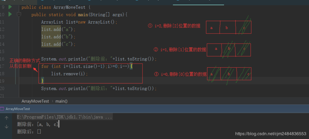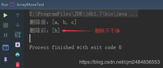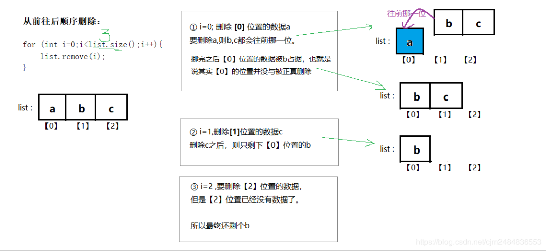 list.add("c");System.out.println("删除前:"+list.toString());//顺序删除节点错误示范:从前往后删----会删不干净