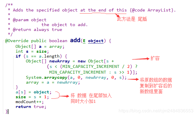 如果原数组的大小不够会先进行扩容。最终将数据添加在尾部,同时大小加1。源码如下: