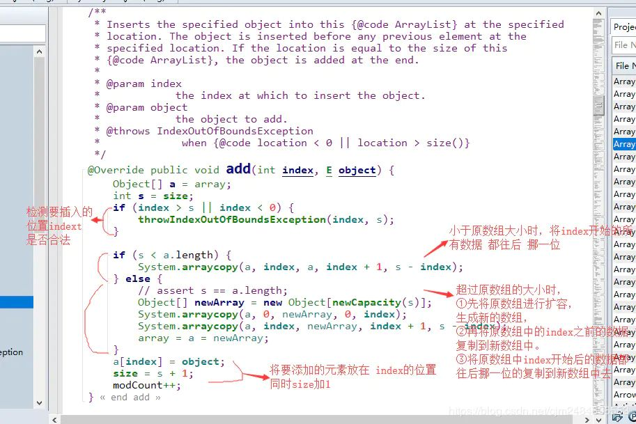 了解了插入的核心步骤之后,我们就来看看 add(int index, E object)的源码中,插入一个元素到指定位置具体是怎么实现的吧。