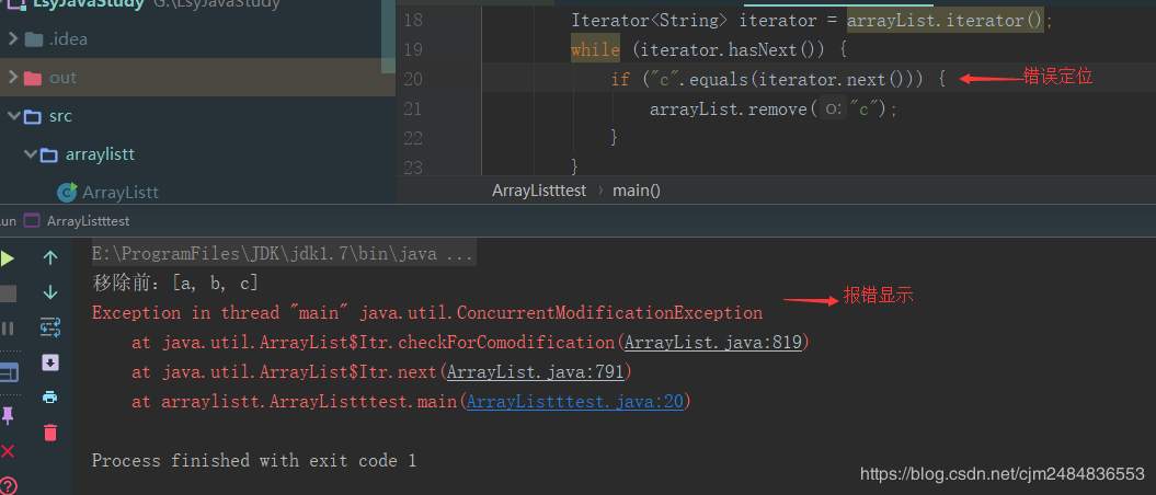 ArrayList arrayList = new ArrayList();arrayList.add("a");arrayList.add("b");arrayList.add("c");System.out.println("移除前:" + arrayList);Iterator
