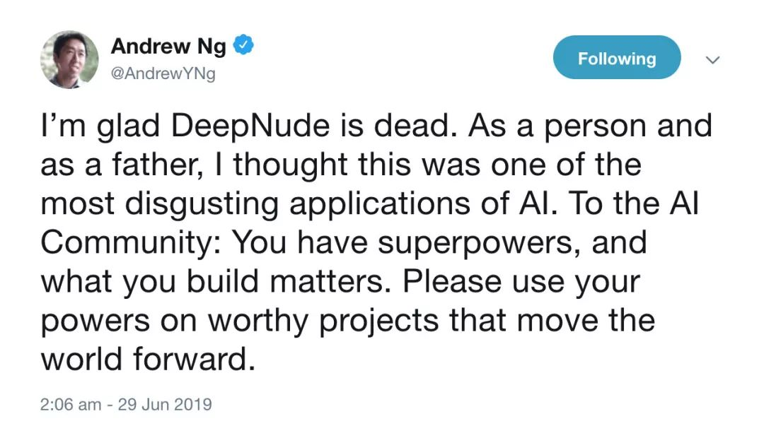 随后人工智能与机器学习权威专家吴恩达也发推表示,很高兴看到 Deepnude 消失,我们应当把能力用在更有价值的地方,去推动世界的发展: