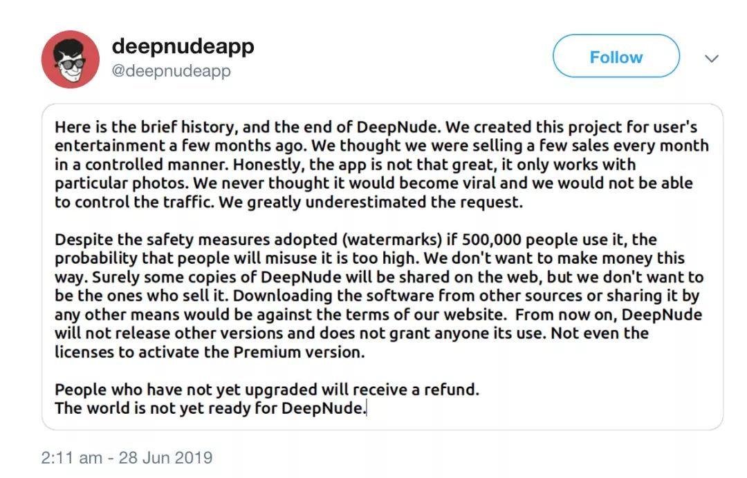 作者也在 Twitter 上表示,这项技术所带来的影响是始料未及的,即日起 Deepnude 将停止发版更新,并退款给付费会员: