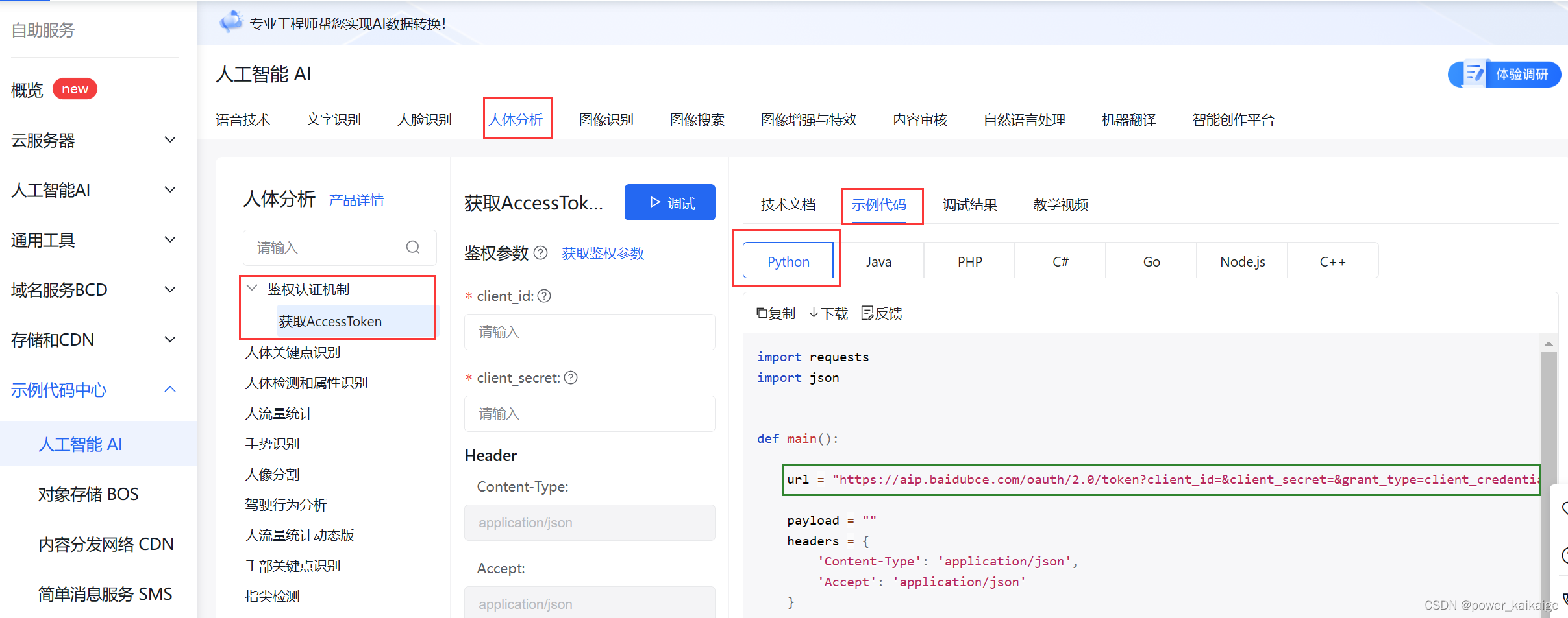 (2)人体分析->获取AccessToken->示例代码->Python;绿色方框就是