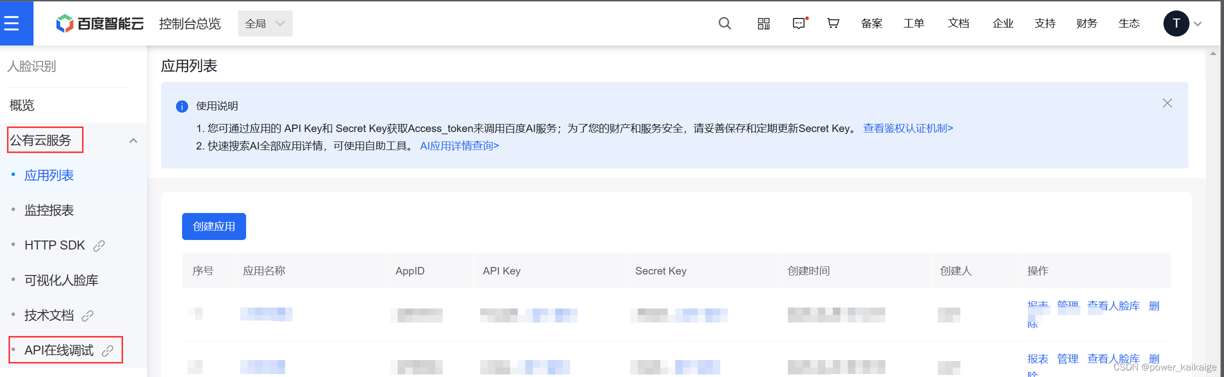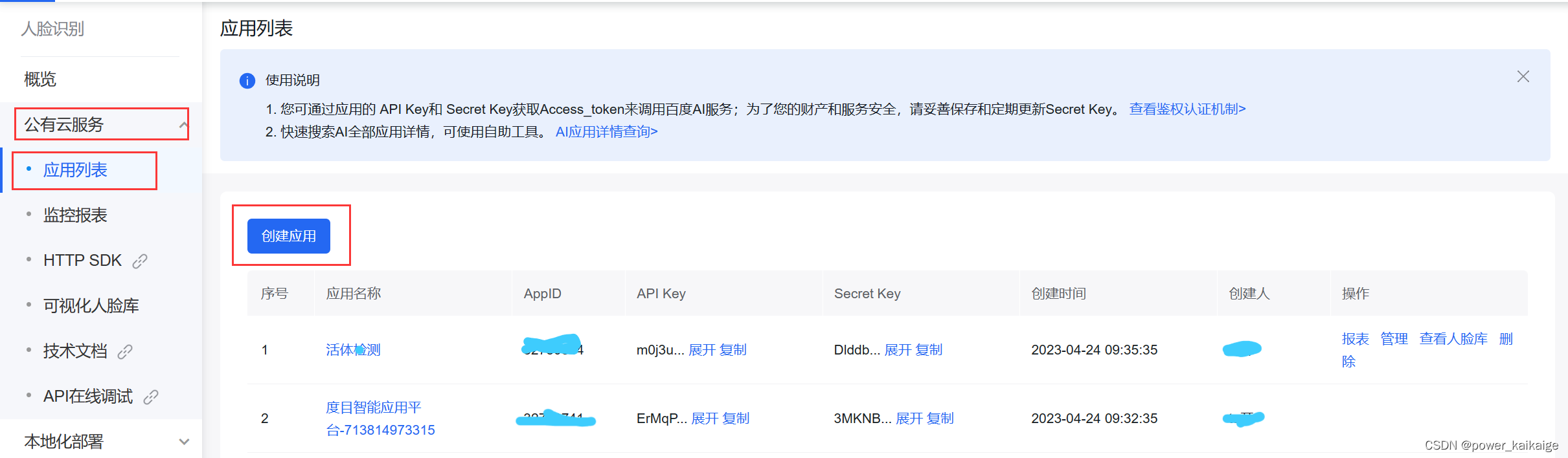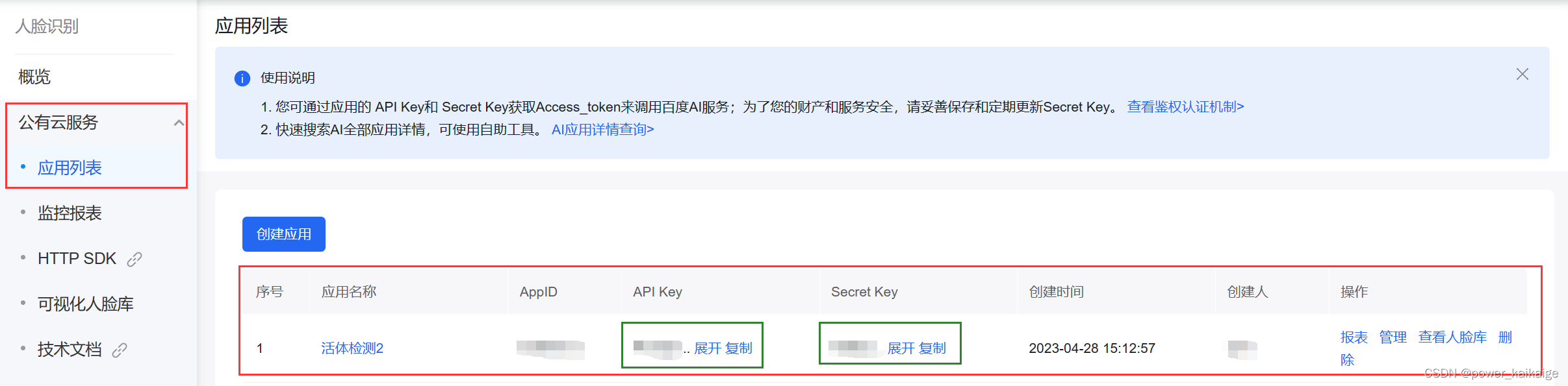 3. 再次返回应用列表,可看到创建的应用信息,API Key 与 Secret Key在绿色框里