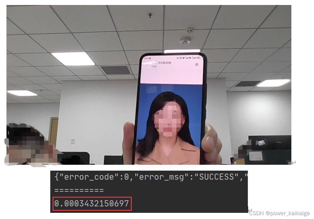 def api_interface(base_str = None):url = "https://aip.baidubce.com/rest/2.0/face/v3/faceverify?access_token=" + get_access_token()payload = json.dumps([{"image":base_str,"image_type": "BASE64","face_field": "spoofing"}])headers = {'Content-Type': 'application/json'}response = requests.request("POST", url, headers=headers, data=payload)# 查看返回的结果print(response.text)print("="*10)# 查看预测分数print(response.json()["result"]["face_liveness"])if response.json()["error_code"] != 0:return 0elif response is None:# print("Null")return 0.0else:return response.json()["result"]["face_liveness"]def get_access_token():"""使用 AK,SK 生成鉴权签名(Access Token):return: access_token,或是None(如果错误)"""url = "https://aip.baidubce.com/oauth/2.0/token"params = {"grant_type": "client_credentials", "client_id": API_KEY, "client_secret": SECRET_KEY}# print(str(requests.post(url, params=params).json().get("access_token")))return str(requests.post(url, params=params).json().get("access_token"))if __name__ == '__main__':f = open('test.jpg', 'rb')image = base64.b64encode(f.read())image64 = str(image, 'utf-8')api_interface(image64)
