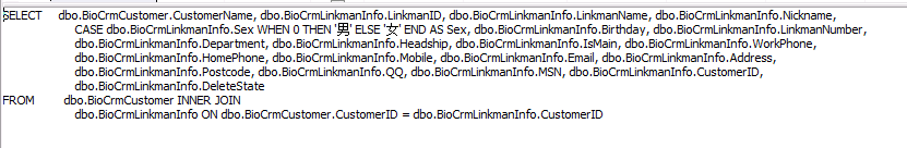 /// /// 添加一条联系人记录/// /// BioCrmLinkmanInfo对象/// int public int LinkmanInfoADD( BioCrmLinkmanInfo LinkMan){SqlParameter[] pars = new SqlParameter[]{new SqlParameter("@LinkmanName",LinkMan.LinkmanName),new SqlParameter("@Nickname",LinkMan.Nickname),new SqlParameter("@Sex",LinkMan.Sex),new SqlParameter("@Birthday",LinkMan.Birthday),new SqlParameter("@LinkmanNumber",LinkMan.LinkmanNumber),new SqlParameter("@Department",LinkMan.Department),new SqlParameter("@Headship",LinkMan.Headship),new SqlParameter("@IsMain",LinkMan.IsMain),new SqlParameter("@WorkPhone",LinkMan.WorkPhone),new SqlParameter("@HomePhone",LinkMan.HomePhone),new SqlParameter("@Mobile",LinkMan.Mobile),new SqlParameter("@Email",LinkMan.Email),new SqlParameter("@Address",LinkMan.Address),new SqlParameter("@Postcode",LinkMan.Postcode),new SqlParameter("@QQ",LinkMan.QQ),new SqlParameter("@MSN",LinkMan.MSN),new SqlParameter("@CustomerID",LinkMan.CustomerID)};return DataBaseHelper.ExcuteSqlReturnInt("BioCrmLinkmanInfo_ADD", CommandType.StoredProcedure, pars);}/// /// 修改联系人信息/// /// /// int public int LinkmanInfoUpdate(BioCrmLinkmanInfo LinkMan){SqlParameter[] pars = new SqlParameter[]{new SqlParameter("@LinkmanID",LinkMan.LinkmanID),new SqlParameter("@LinkmanName",LinkMan.LinkmanName),new SqlParameter("@Nickname",LinkMan.Nickname),new SqlParameter("@Sex",LinkMan.Sex),new SqlParameter("@Birthday",LinkMan.Birthday),new SqlParameter("@LinkmanNumber",LinkMan.LinkmanNumber),new SqlParameter("@Department",LinkMan.Department),new SqlParameter("@Headship",LinkMan.Headship),new SqlParameter("@IsMain",LinkMan.IsMain),new SqlParameter("@WorkPhone",LinkMan.WorkPhone),new SqlParameter("@HomePhone",LinkMan.HomePhone),new SqlParameter("@Mobile",LinkMan.Mobile),new SqlParameter("@Email",LinkMan.Email),new SqlParameter("@Address",LinkMan.Address),new SqlParameter("@Postcode",LinkMan.Postcode),new SqlParameter("@QQ",LinkMan.QQ),new SqlParameter("@MSN",LinkMan.MSN),new SqlParameter("@CustomerID",LinkMan.CustomerID)};return DataBaseHelper.ExcuteSqlReturnInt("BioCrmLinkmanInfo_Update", CommandType.StoredProcedure, pars);}/// /// 根据客户ID号返回客户详细信息/// /// id/// BioCrmLinkmanInfo public BioCrmLinkmanInfo getLinkManByID(string id){BioCrmLinkmanInfo linkman=null;//BioCrmLinkmanInfo linkman = new BioCrmLinkmanInfo();SqlDataReader reader= SqlComm.GetDataReaderByCondition("BioCrmLinkmanInfo", "*", " LinkmanID= " + id);if (reader.Read()){linkman = new BioCrmLinkmanInfo(){LinkmanID = int.Parse(reader["LinkmanID"].ToString()),LinkmanName = reader["LinkmanName"].ToString(),Nickname = reader["Nickname"].ToString(),Address = reader["Address"].ToString(),Birthday = Convert.ToDateTime(reader["Birthday"].ToString()),WorkPhone = reader["WorkPhone"].ToString(),Sex = Convert.ToBoolean(reader["Sex"].ToString()),QQ = reader["QQ"].ToString(),Postcode = reader["Postcode"].ToString(),MSN = reader["MSN"].ToString(),CustomerID = int.Parse(reader["CustomerID"].ToString()),Mobile = reader["Mobile"].ToString(),LinkmanNumber = reader["LinkmanNumber"].ToString(),Department = reader["Department"].ToString(),HomePhone = reader["HomePhone"].ToString(),IsMain = Convert.ToBoolean(reader["IsMain"].ToString()),Headship = reader["Headship"].ToString(),DeleteState = Convert.ToBoolean(reader["DeleteState"].ToString()),Email = reader["Email"].ToString()}; } reader.Close();return linkman; }