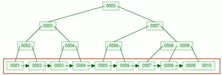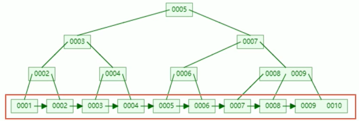 所有数据都按照键值大小顺序放在同一层的叶子节点上,并且所有相邻的叶子节点使用链表进行连接,不再需要中序遍历。