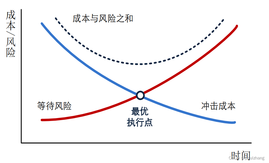 其次,隐形交易成本中各种成本,之间是互相影响的,加上上述第一个原因,很难对其求最优解。例如:对于机会成本来说,最优的方式是在交易一开始就提交所有的订单。但是,如果要考虑到冲击成本,那得在机会成本和冲击成本中找到一个最优订单执行时间。如下图: