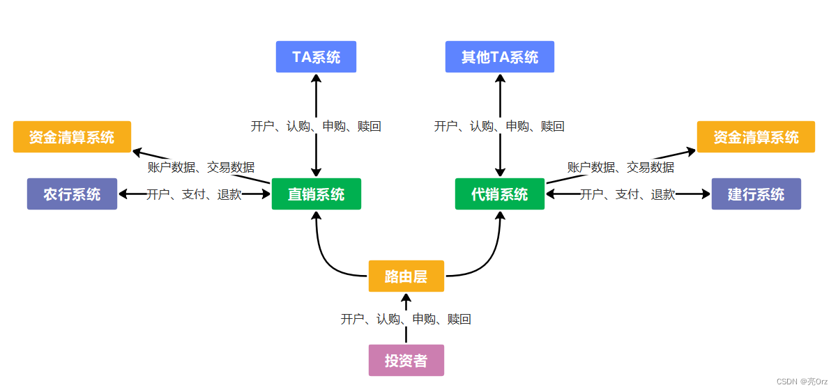 - 代销系统:代销系统理论上可以销售市面上所有基金公司的基金产品。基金公司与多家基金公司签署相关的代销协议,并与其TA系统进行联通测试后,即可上线多类产品供投资者选择