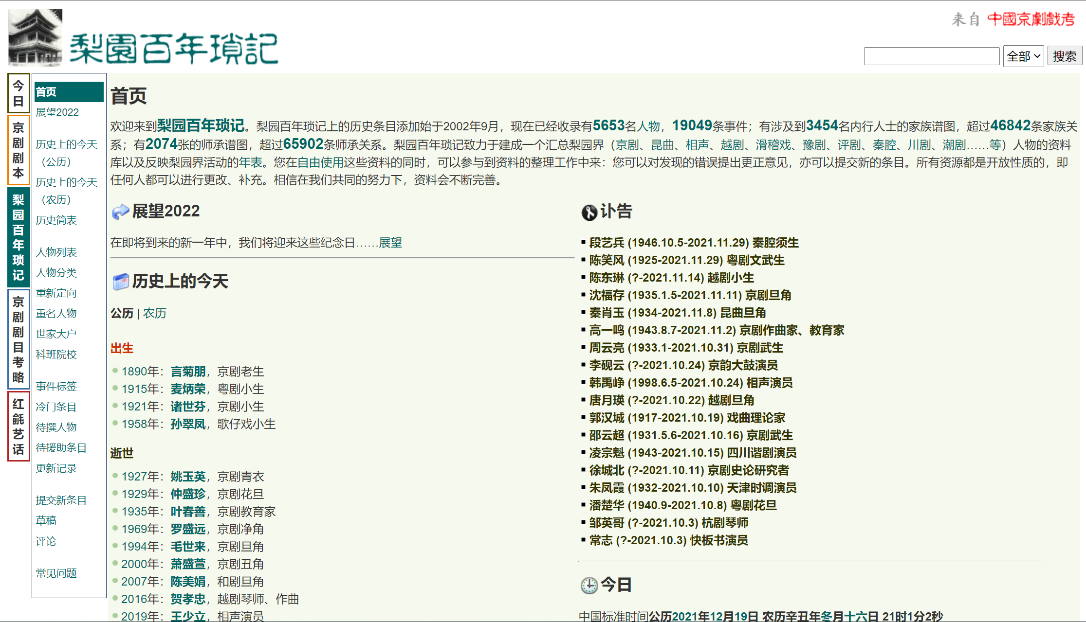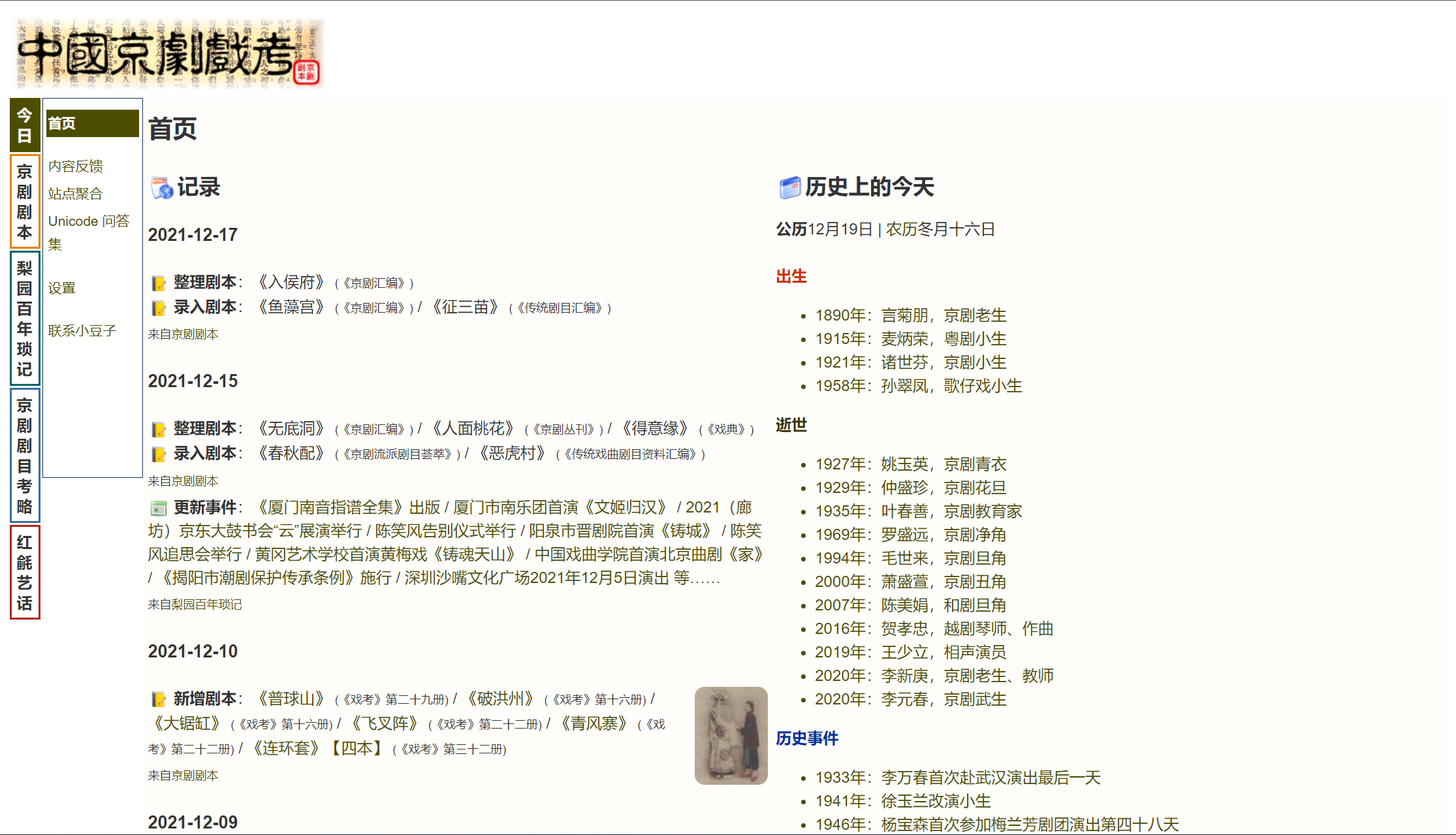 “中国京剧戏考”首页展现资料收录进度、历史上的今天、每周推荐人物介绍、每周推荐曲目等信息。左侧的功能栏具体分为:剧本、历史、剧目和音频记录。