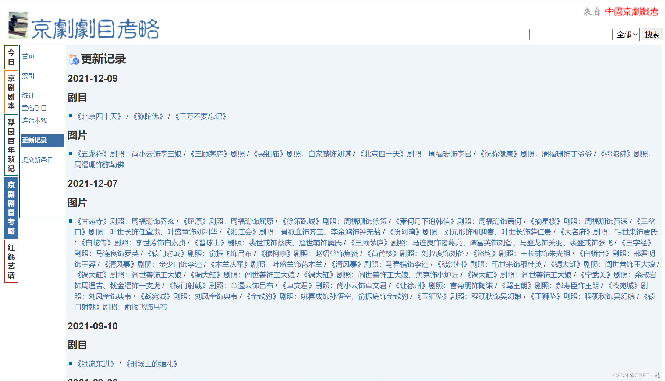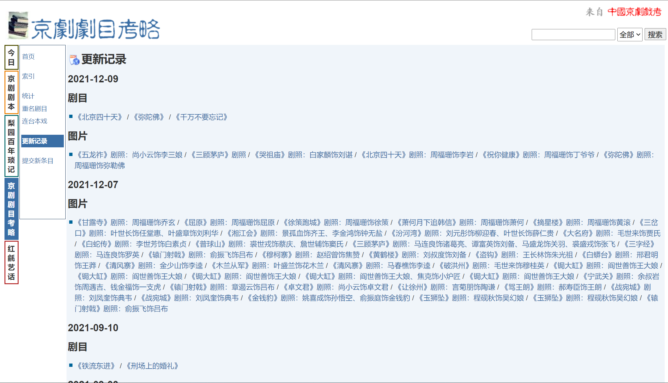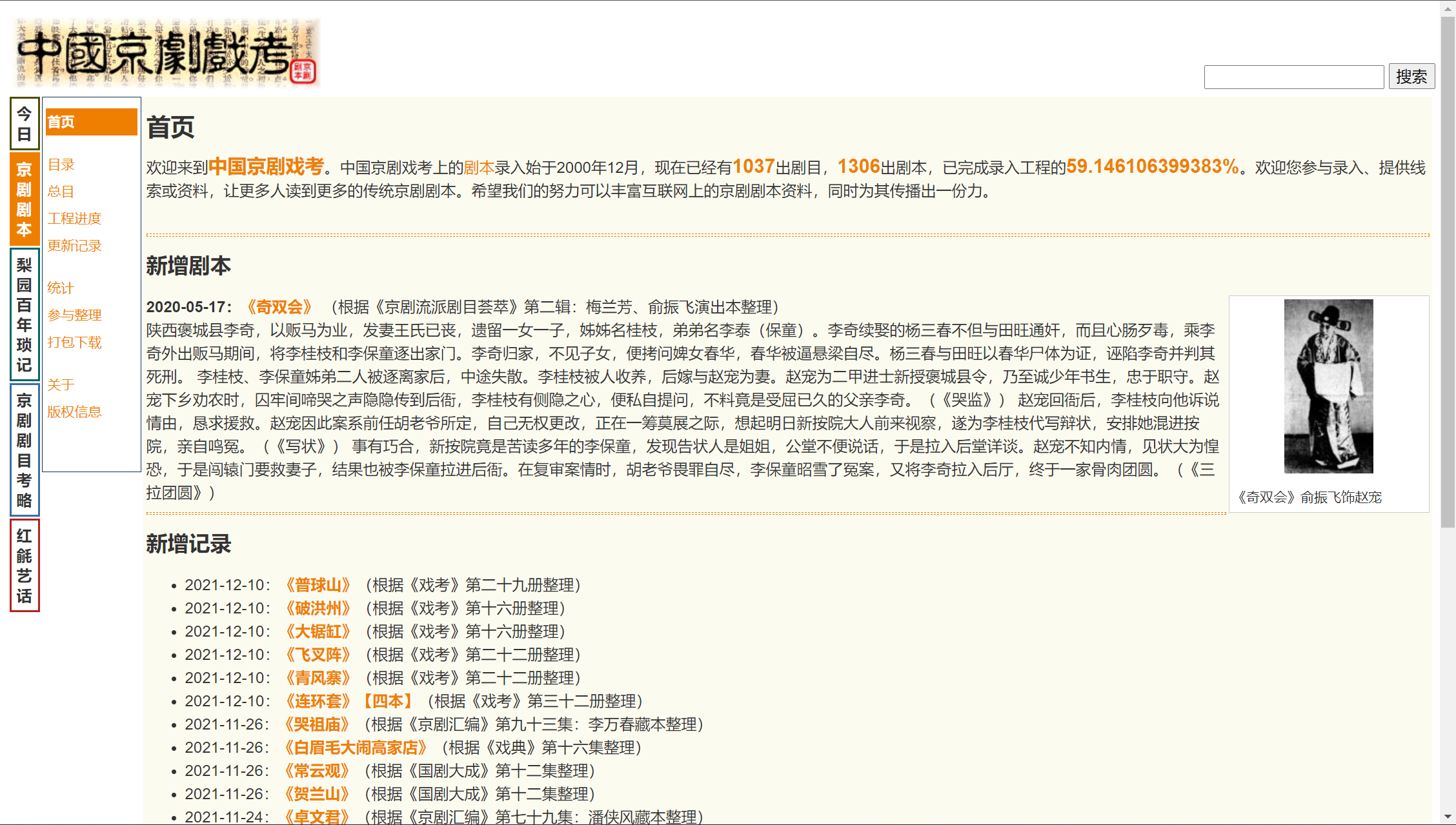 第一个分区“京剧剧本”,从2000年12月开始收录剧本,目前已收录1037出剧目和1306出剧本。支持检索和目录搜索功能。