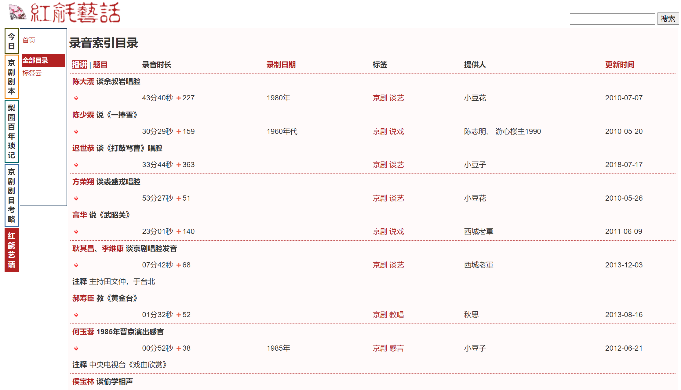 第四个分区“红毹艺话”,收录戏曲名家的讲话录音,包括说戏、教唱、谈艺等类别的录音,覆盖京剧、评剧、昆曲等戏曲曲艺形式。所有录音可以下载后欣赏。