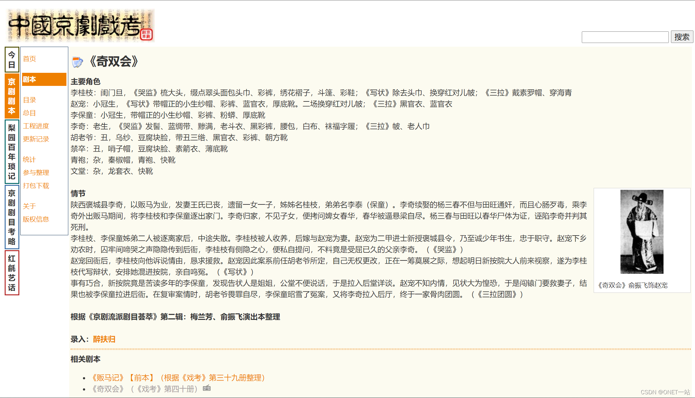 以《奇双会》为例,“中国京剧戏考”收录了《奇双会》的主要角色、情节、剧照、相关剧本、全剧剧本和收录的参考资料。