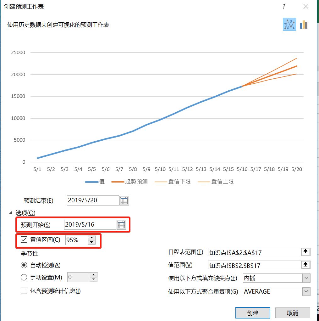 当然这里我们再来看一下选项里是什么。可以自定义预测开始的日期,置信区间默认是95%,时间线和值的范围也可以自定义,通常这些值默认即可。