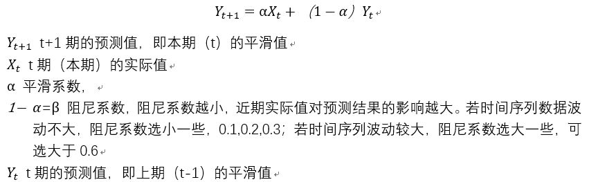 是移动平均法的改进,通过对历史数据的远近不同赋予不同的权重进行预测,对较近的历史数据给予较大的权重,是用的最多的一种预测方法。原理是任一期的指数平滑值都是本期实际观察值与前一期指数平滑值的加权平均。