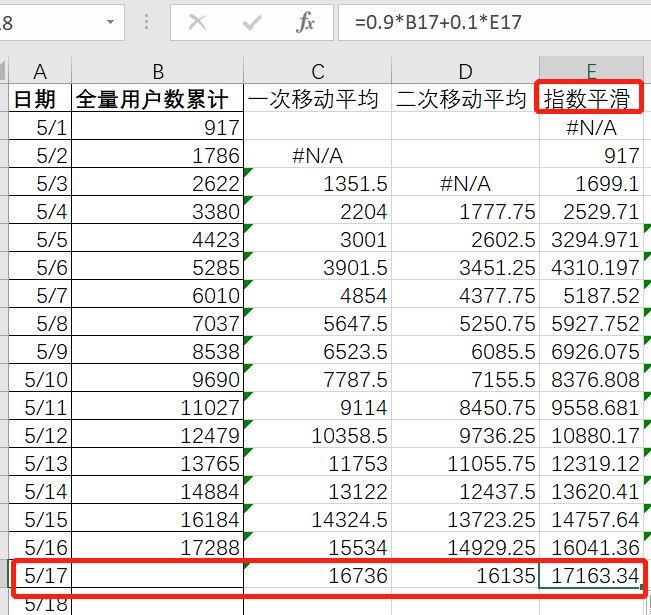 Excel有一个非常强大且实用的功能,数据——预测工作表,基于历史时间数据来预测未来任一时间段内的数据,当然基本原理是上面讲到的移动平均法和指数平滑法。在有数据的区域选择预测工作表,数据源通常需要包含时间轴和数据,Excel会自动选择含有时间和数据的区域。预测结束的日期即你想要预测结束的时间,比如通常工作中我们需要根据本月已有的几天数据预测一整个月的数据情况,预测结束日期就可以选择到月底。图形的输出方式可以选择折线图或柱状图。一般直接点创建即可完成一次预测。