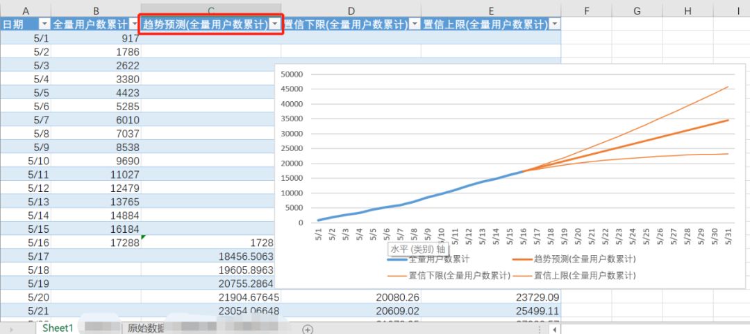 最后会得到一个新的sheet表,表里包含时间轴、历史数据、预测数据、置信上限、下限和一个预测图表。其中预测数据是用预测函数(forecast.ets)计算而得,是用指数平滑的思想做的。
