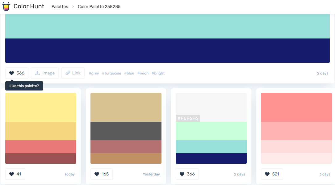 ColorHunt 网站是一个致力于帮助产品设计师们更好的选择颜色搭配组合的站点,从互联网中收集了海量的完美色彩组合,你可以把这些颜色组合运用到任何产品设计项目,方便设计师们找到最佳的色系搭配组合。