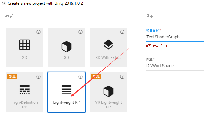 新建工程的时候模板选中Lightweight RP,新建工程即可。如图: