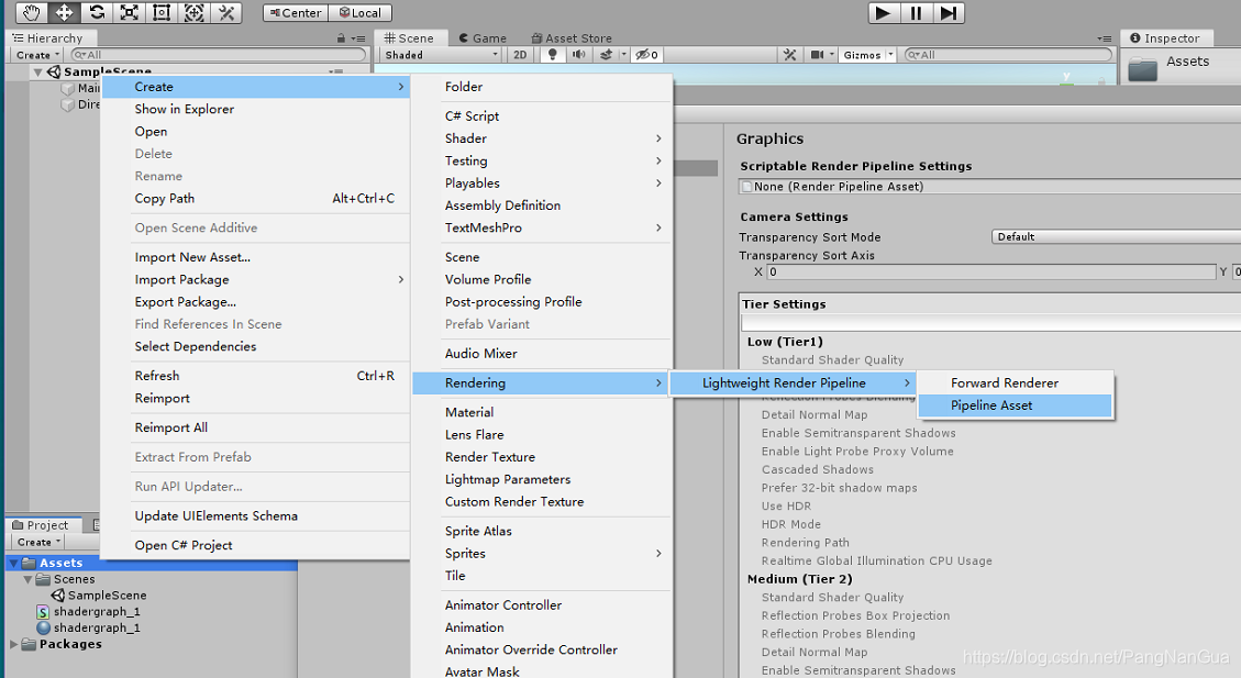 把LightweightRenderPipelineAsset赋值给Project Setting面版下的Graphics/Scriptable Render Pipleline Settings,如图示: