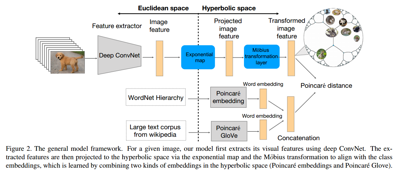对于图像,这里使用ResNet来提取特征,最后提取的结果是欧式空间的2048维向量,为了将这个向量转换到双曲空间,这里使用了双曲特征转换网络(hyperbolic visual feature transform network)。网络主要包含两部分,指数映射(exponential map)将图像特征从欧式空间映射到双曲空间,M¨obius转换网络(M¨obius transformation network)用来对齐图像和标签。