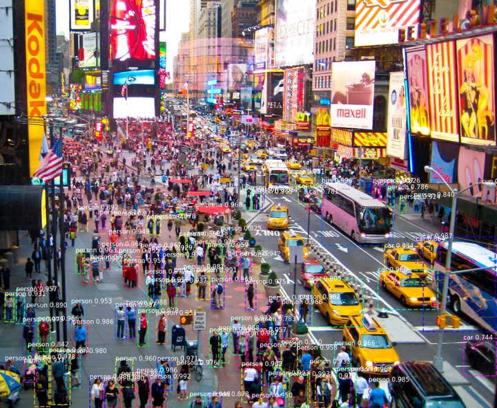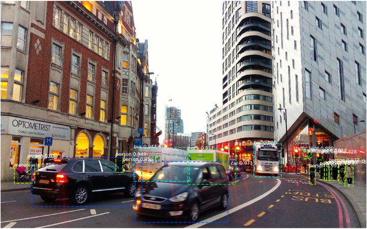 ,那我们接下来将这些Region输入普通的分类网络,即第一张Faster R-CNN的结构图中最上面的部分,即可得到整个网络最终的输出classification,这里的class(车、人、狗。。)才真正对应了COCO数据集80类中的具体类别。