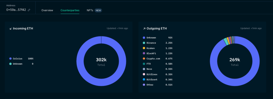 查看这币10万枚ETH的 交易,它是从一个 OG 以太坊地址获得资金的,该地址在此之前立即从一个地址收到了资金,Nansen 显示已从一个钱包中收到了全部 的 30.2万 枚ETH,Nansen 标记为加密货币贷方Celsius。