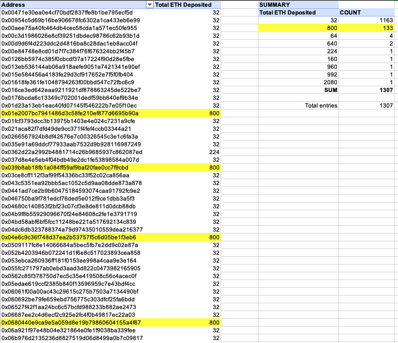 需要进行更深入的分析,因此我们从 Etherscan上将截止2021 年 6 月 22 日的存款合约交易下载 并上传到 Excel。数据很清楚。