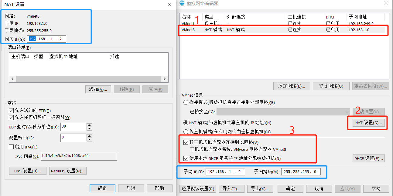 NAT设置中的网关IP要与Windows中网络配置中网关一样。