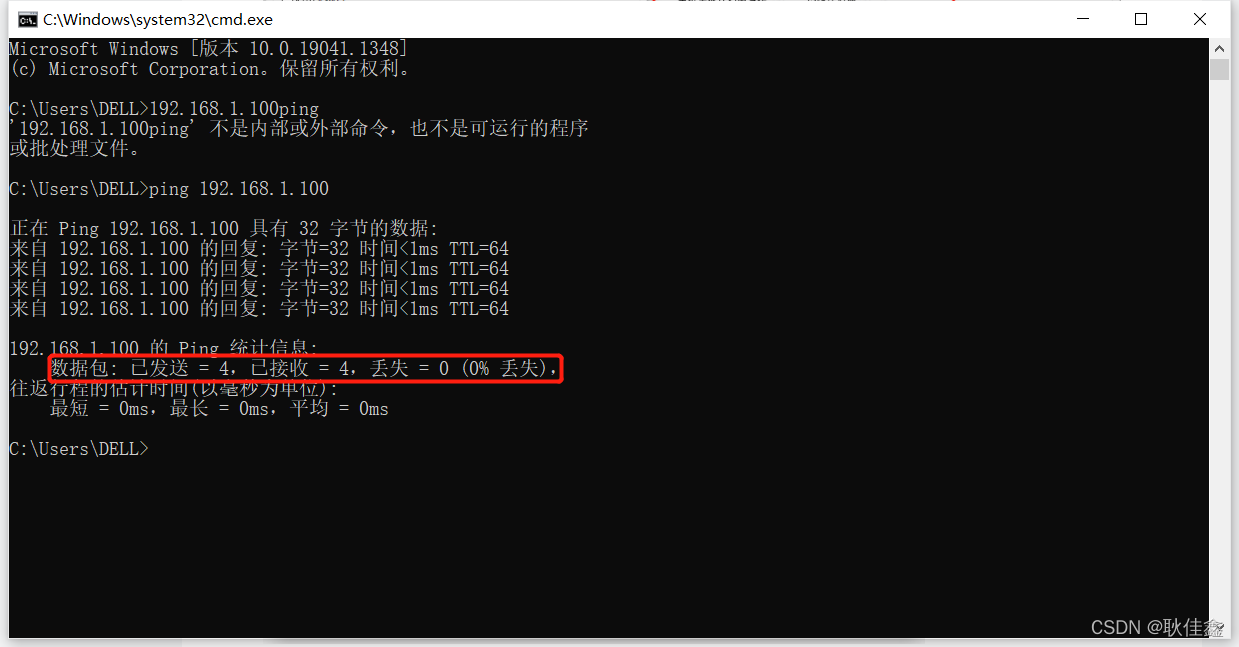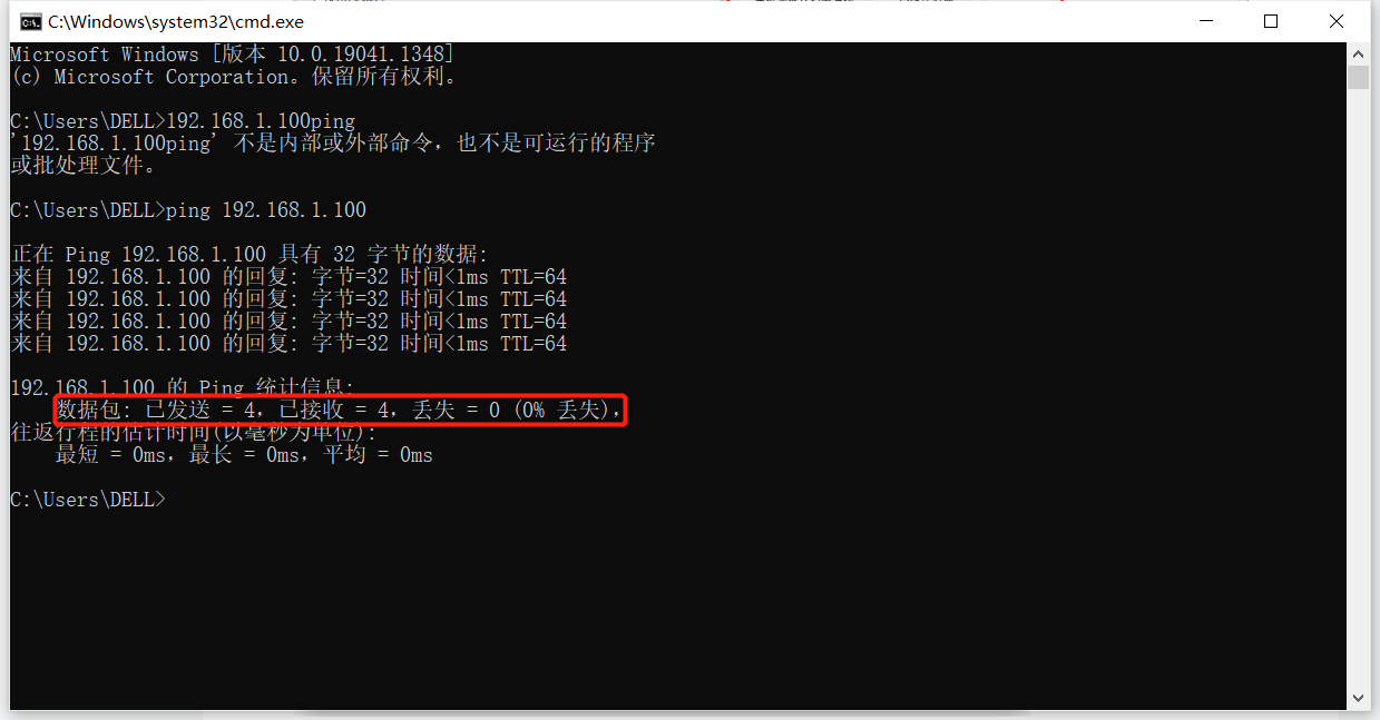 已发送数量=已接收数量,丢失=0,则证明ping成功。