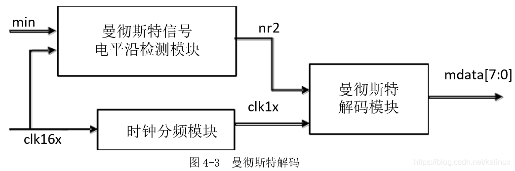 解码器分为,曼彻斯特信号电平沿检测模块,时钟分频模块,曼彻斯特解码模块;