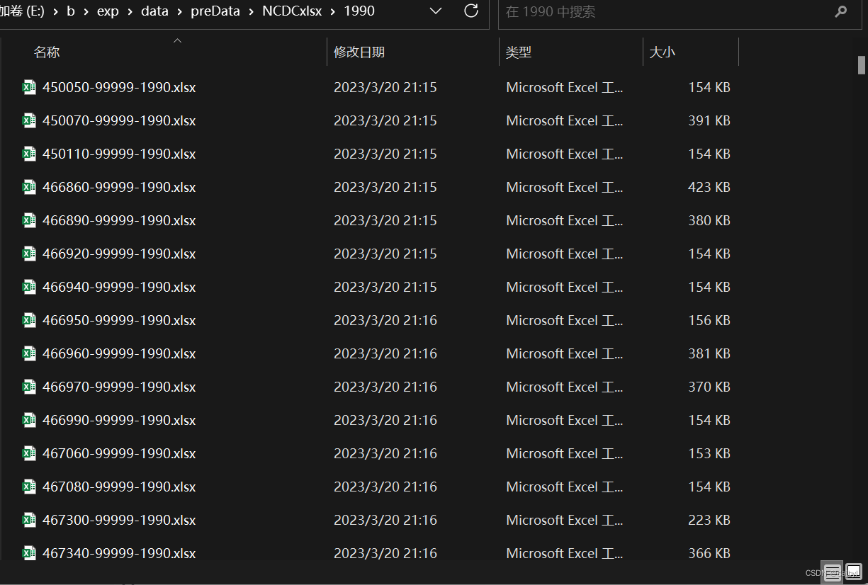 每个文件夹下有几百个当年站点数据的Excel表文件,以1990年的文件为例: