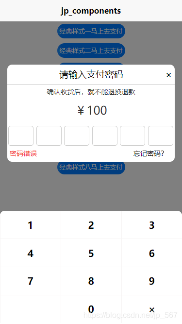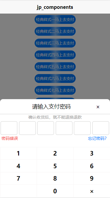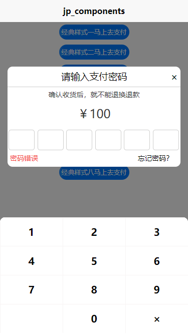 经典样式一马上去支付 import jpPwd from '@/components/jp-pwd/jp-pwd.vue';export default {components: {jpPwd},methods: {toOpen() {this.$refs.jpPwds.toOpen()},completed(e) {if (e == '123456') {this.$refs.jpPwds.toCancel()} else {this.pwd.msg = '密码错误'this.$refs.jpPwds.backs()}},forget() {console.log('忘记密码')}}}