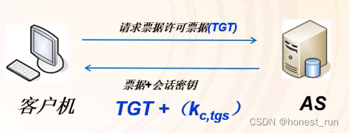 | 第一次:获得票据许可票据(TGT) 客户机向AS发送访问TGS请求(明文) 请求信息:用户名、IP地址、时间戳、随机数等 AS验证用户(只验证是否存在,不验证真假) AS给予应答 TGT(包含TGS会话密钥),使用KDC密码加密 其他信息(包含TGS会话密钥),使用用户密码加密 |