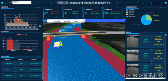 桥梁防碰撞预警系统能够实现内河监控场景的实时监控显示和视频存储功能,便于采集数据进行离线数据实验分析。具备三维视频数据和可见光视频数据同时采集、同时显示的功能,从而获得内河航道的清晰视频源;系统能够实现基于三维激光雷达点云检测进行船舶的三维尺寸非接触测量;对监控区域内的多船舶目标进行实时检测、跟踪;